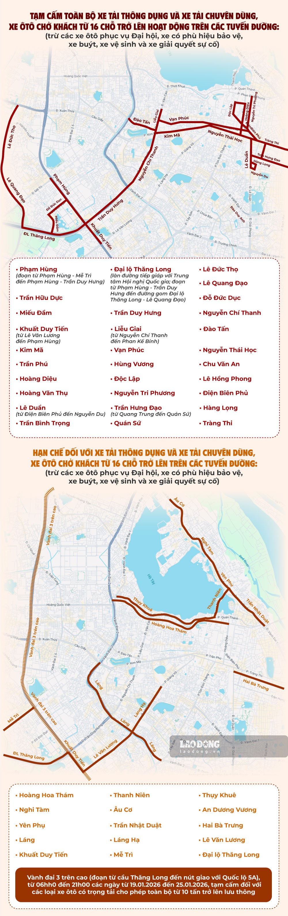 Các đường cấm hoàn toàn (cho xe tải & xe trên 16 chỗ): Phạm Hùng (đoạn Mễ Trì – Trần Duy Hưng), Đại lộ Thăng Long (làn sát Trung tâm Hội nghị), Trần Hữu Dực, Lê Đức Thọ, Lê Quang Đạo, Đỗ Đức Dục, Miếu Đầm, Trần Duy Hưng.