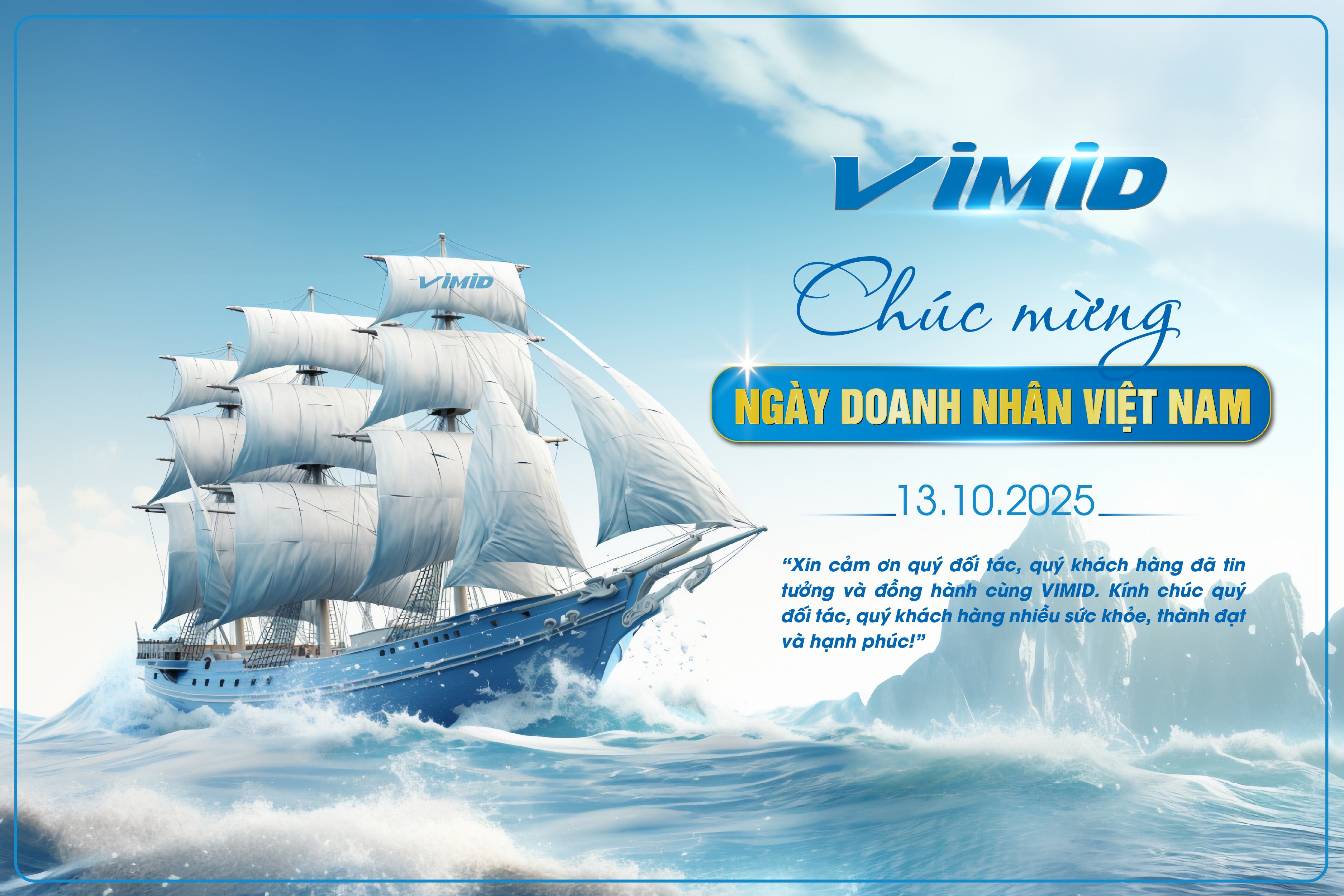 Nhân dịp đặc biệt này, VIMID xin gửi lời chúc mừng trân trọng tới Ban lãnh đạo Công ty VIMID, Quý Đối tác và Quý Khách hàng, cùng toàn thể doanh nhân Việt Nam – những người đang nỗ lực mỗi ngày để góp phần làm nên một nền kinh tế vững mạnh. Xin kính chúc Quý Anh/Chị luôn vững tin – sáng tạo – bứt phá, tiếp tục đồng hành cùng cộng đồng doanh nghiệp Việt Nam trên con đường hướng tới thịnh vượng, phát triển và bền vững.