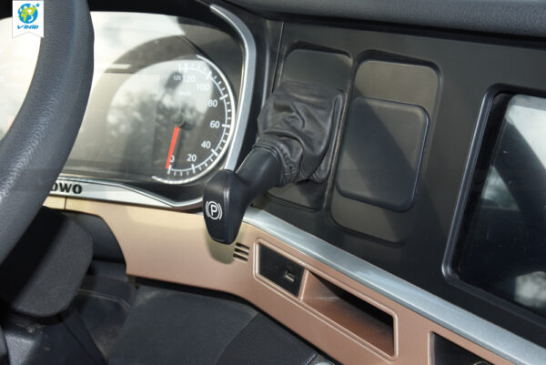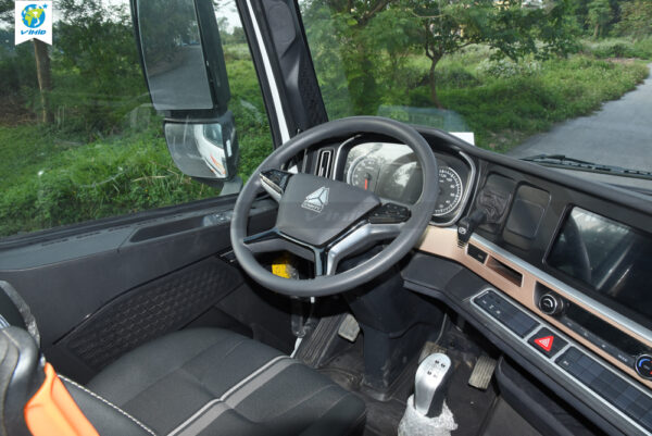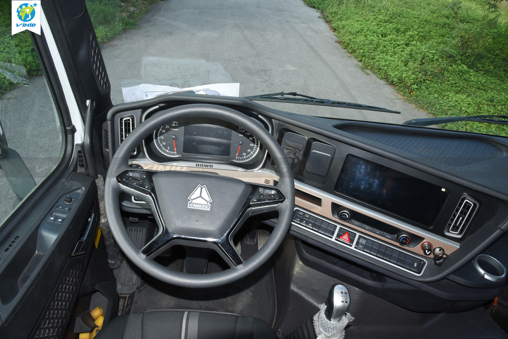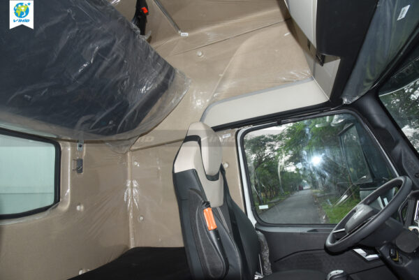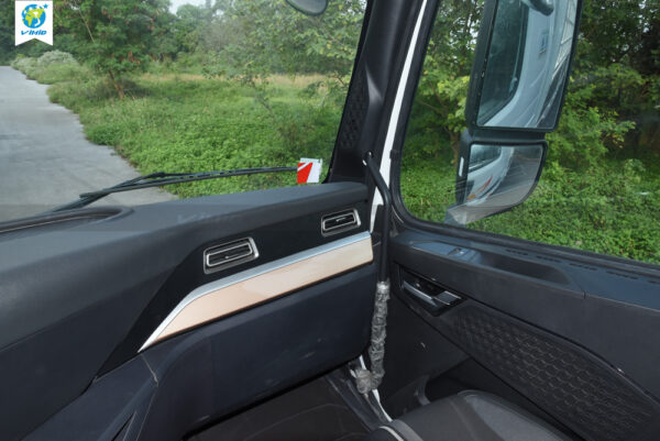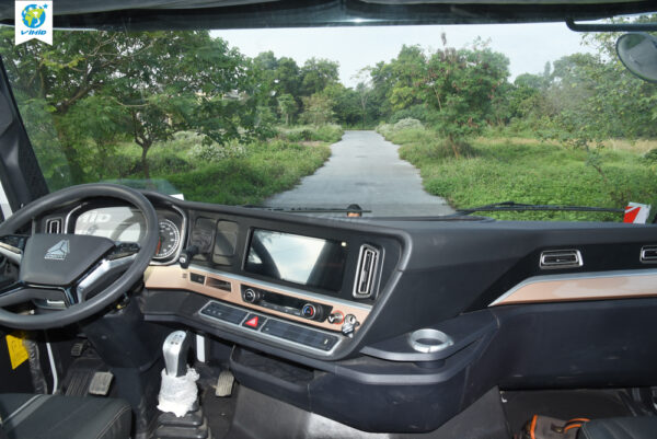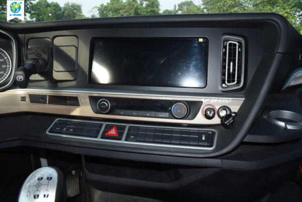 - Central control panel: redesigned while retaining all the features previously available on the T7H series. The parking brake and trailer brake controls have been repositioned to the upper section. It is equipped with a new 12.3-inch touchscreen LCD integrated with a factory-installed 360-degree camera system. The new dashboard also features gear position indicators, speed display, safety warnings, and an air suspension passenger seat.