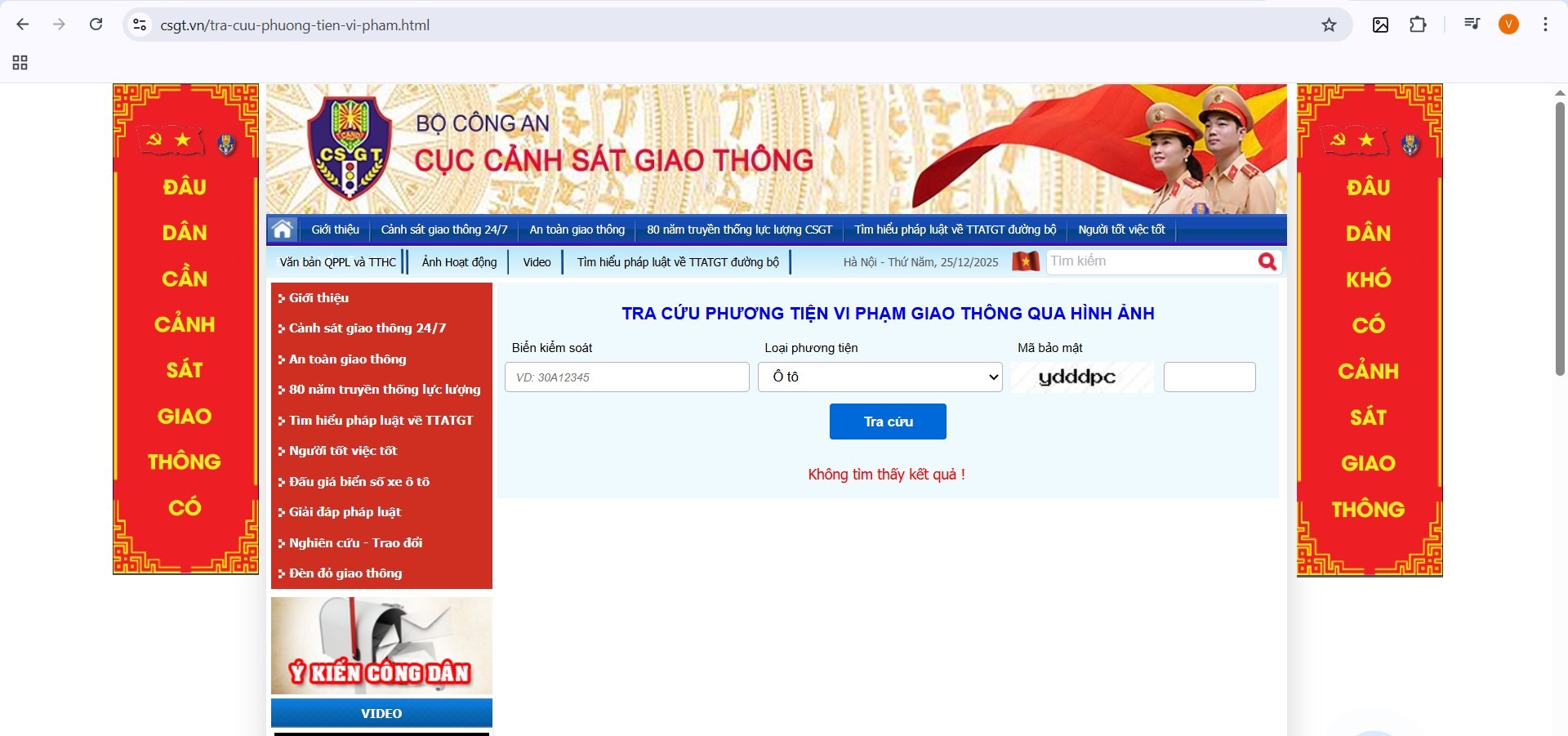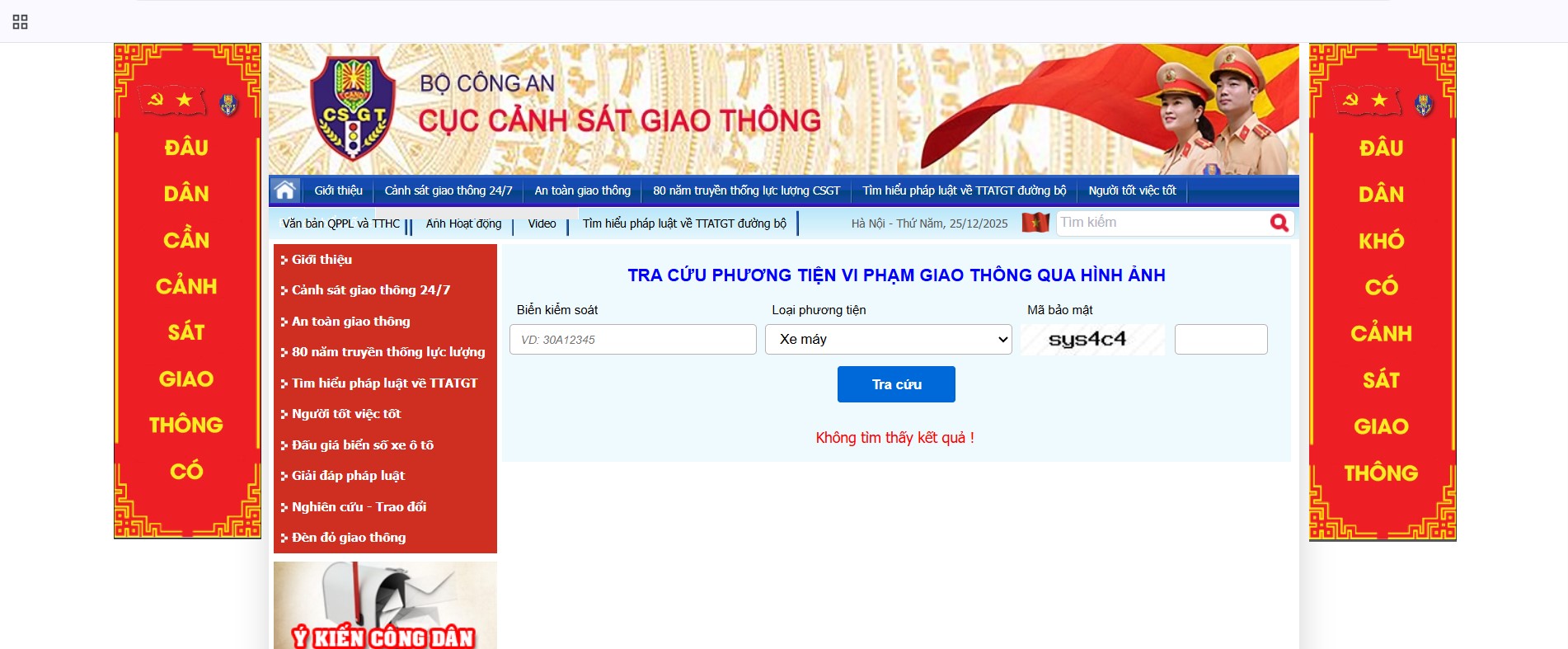 Các bước thực hiện tương tự như trên website của Cục CSGT: Nhập biển số, mã xác nhận và xem kết quả.