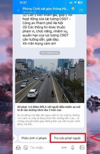 Bước 4: Trong khung chat, các bạn sẽ thấy thanh menu tiện ích. Nhấn chọn mục "Tra cứu phạt nguội" hoặc "Tra cứu vi phạm".