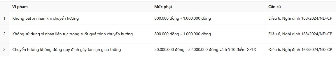 Một trong những yếu tố quan trọng để các bạn chú ý khi tham gia giao thông là mức phạt khi vi phạm quy tắc sử dụng xi nhan khi chuyển hướng ô tô. Theo Nghị định 168/2024/NĐ-CP, mức phạt đối với lỗi xi nhan ô tô được quy định như sau: