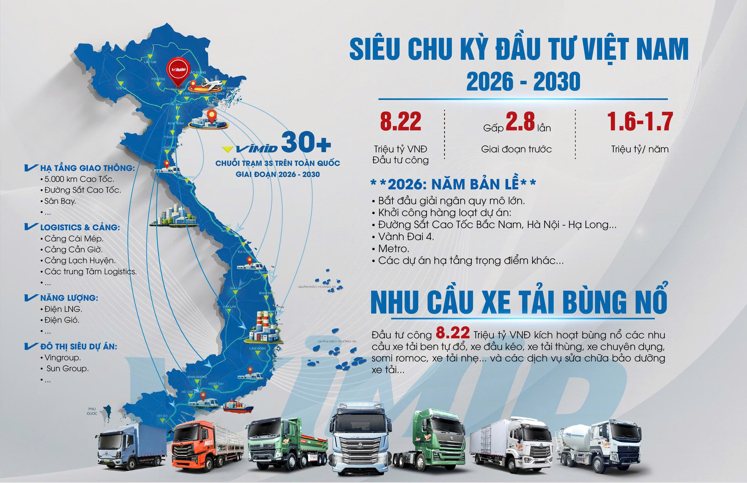 Tổng hòa các yếu tố cho thấy nhu cầu về xe tải đang bước vào một chu kỳ tăng trưởng quy mô lớn và kéo dài. Trong bối cảnh đó, VIMID – với thị phần dẫn đầu phân khúc xe tải hạng trung – hạng nặng và hệ thống trạm dịch vụ 3S phủ rộng toàn quốc, đang ở vị thế trực diện để hấp thụ nhu cầu thị trường, chuyển hóa thành tăng trưởng doanh thu và lợi nhuận trong trung và dài hạn.