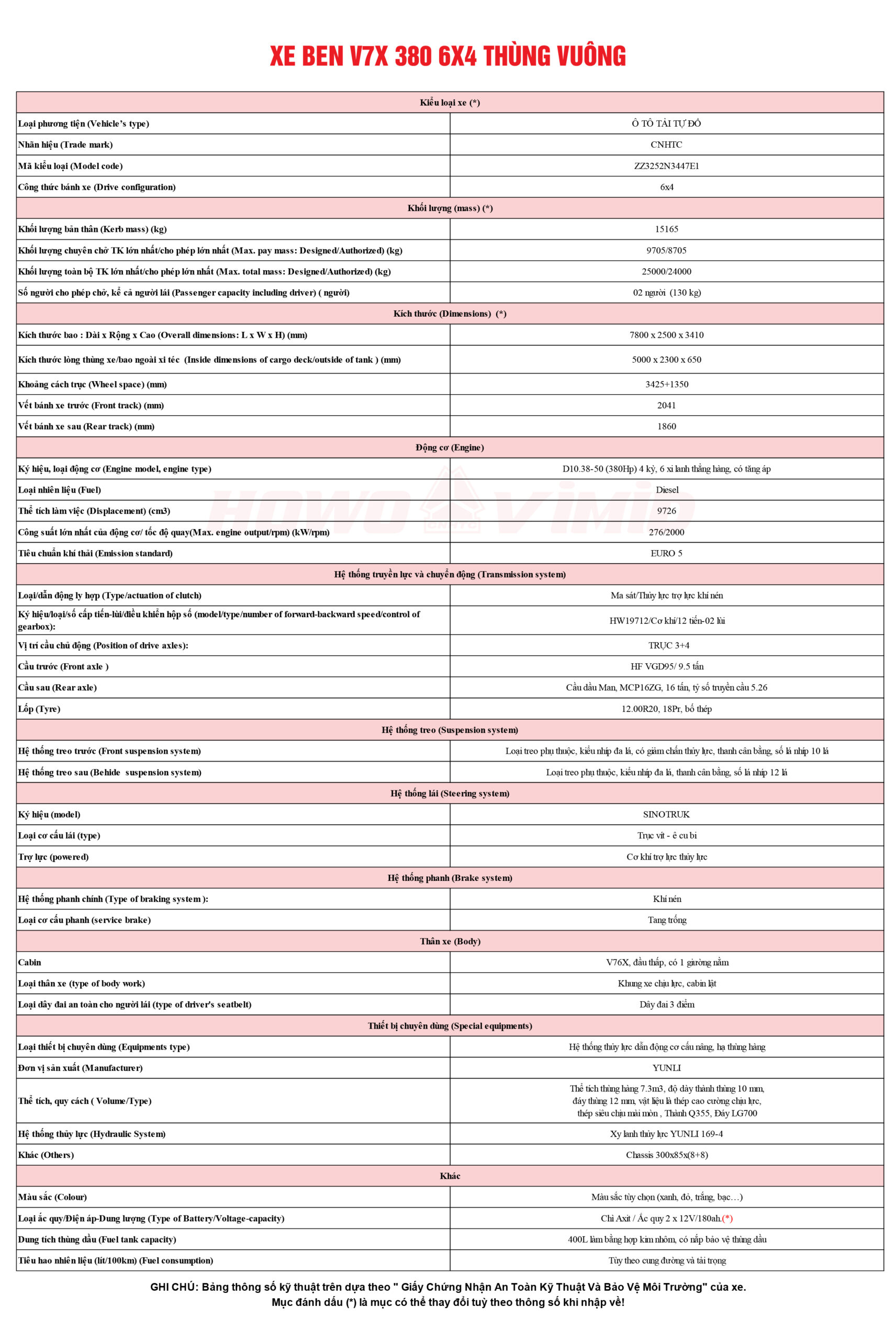 Xe ben Howo V7X 380 6×4 thùng vuông là dòng sản phẩm HOWO, phiên bản xe ben nâng cấp mới nhất của SINOTRUK. Đây là thế hệ được phát triển với sự hợp tác của 3 đơn vị sản xuất xe tải lớn trên thế giới, hội tụ đầy đủ các tiêu chí “nhất” của các đơn vị: An toàn nhất của VOLVO; động lực khỏe mạnh, khung gầm chắc chắn nhất của MAN; trang thiết bị công nghệ tiên tiến nhất của Trung Quốc. Xe phục vụ tốt nhất nhu cầu xe công trình, chạy san lấp mặt bằng, vận chuyển vật liệu xây dựng, xe khai thác…